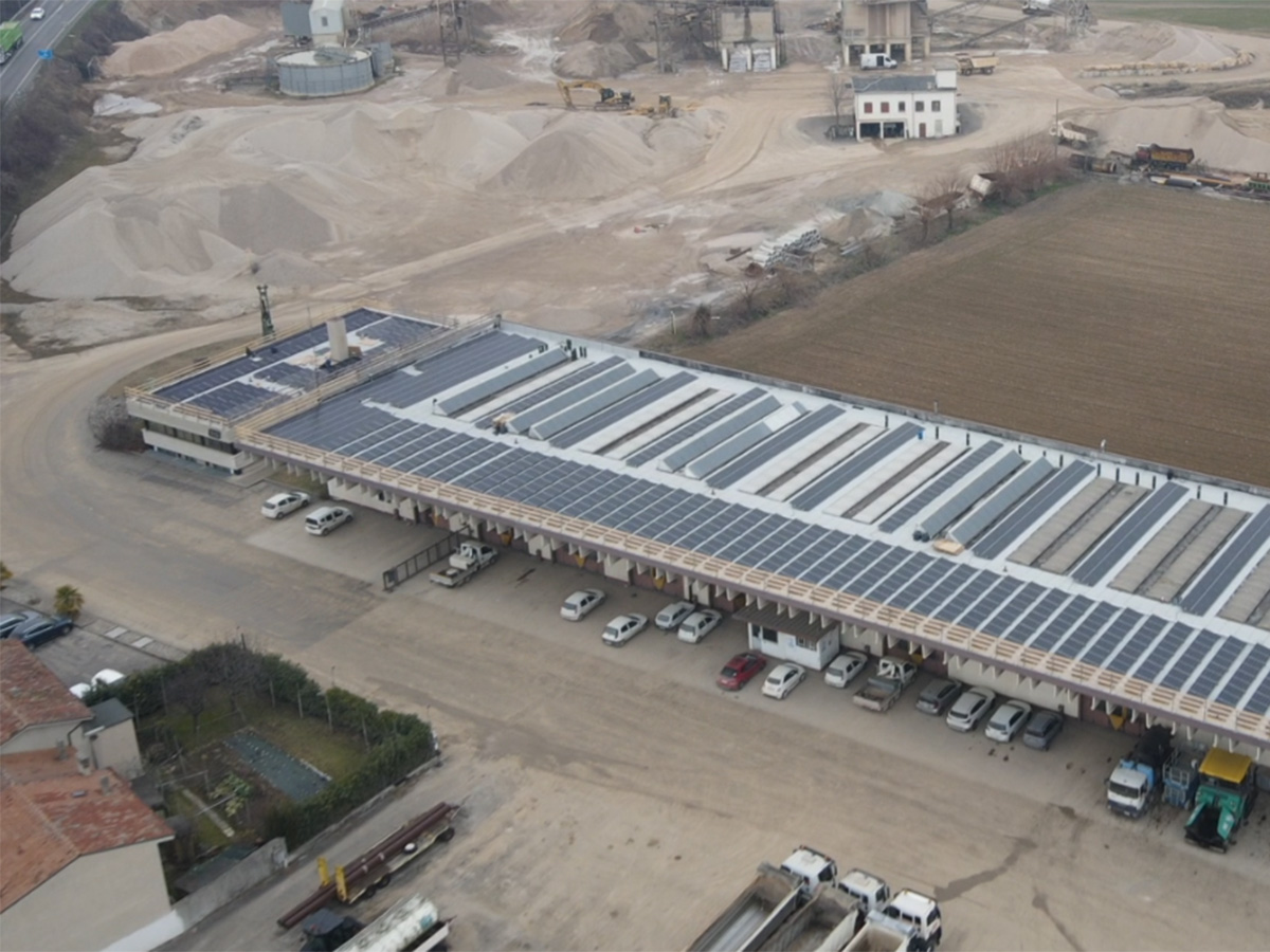 La società S.I.G. SpA (Società Industria Ghiaia), aveva la necessità di abbattere i costi energetici per le sue attività di estrazione, lavorazione e commercio ghiaia. A fronte di un fabbisogno energetico di oltre 450.000 kWh, abbiamo progettato e realizzato un impianto ottimizzando la copertura della sede, sfruttando sia la superficie piana con il supporto di zavorre, che quella a shed. L'installazione ha previsto la posa e collegamento di n. 558 moduli da 410W monocristallini e n. 2 inverter da 110kW.